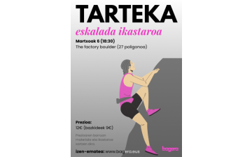 Bagera Elkartetik gogotsu jarraitzen dugu Tarteka egitasmoaren bidez hiriko euskaldunontzako aisialdi-espazioak eta topaguneak sortzen. Oraingoan, kirola eta giro ezin hobea uztartu nahi ditugu; horretarako, eskalada ikastaro bat antolatu dugu martxoaren 6rako.