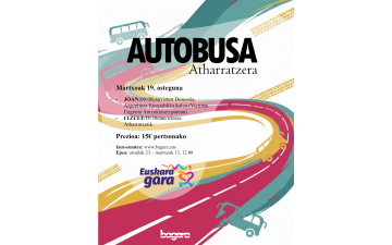 Badator 24. Korrika! Aurtengo edizioa Zuberoan hasiko da, Atharratzen, eta Bageratik une hunkigarri hori bertatik bertara bizitzeko plan borobila prestatu dugu. Martxoaren 19an Donostiatik Atharratzera joateko autobusa antolatu dugu, euskararen aldeko lehen urratsak euskaltzale giro ezin hobean eta elkarrekin emateko. BIDAIAREN XEHETASUNAK: Eguna: Martxoak 19, osteguna....